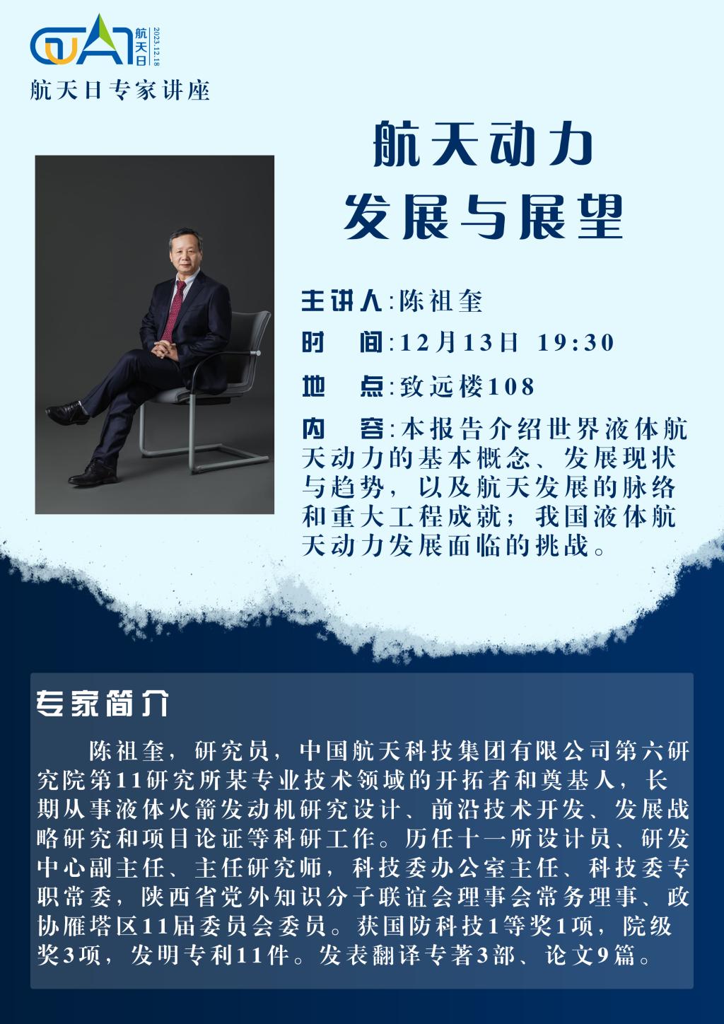 主讲嘉宾:陈祖奎,研究员,中国航天科技集团有限公司第六研究院第11研究所某专业技术领域的开拓者和奠基人,长期从事液体火箭发动机研究设计、前沿技术开发、发展战略研究和项目论证等科研工作。历任十一所设计员、研发中心副主任、主任研究师,科技委办公室主任、科技委专职常委,陕西省党外知识分子联谊会理事会常务理事、政协雁塔区11届委员会委员。获国防科技1等奖1项,院级奖3项,发明专利11件。发表翻译专著3部、论文9篇。
