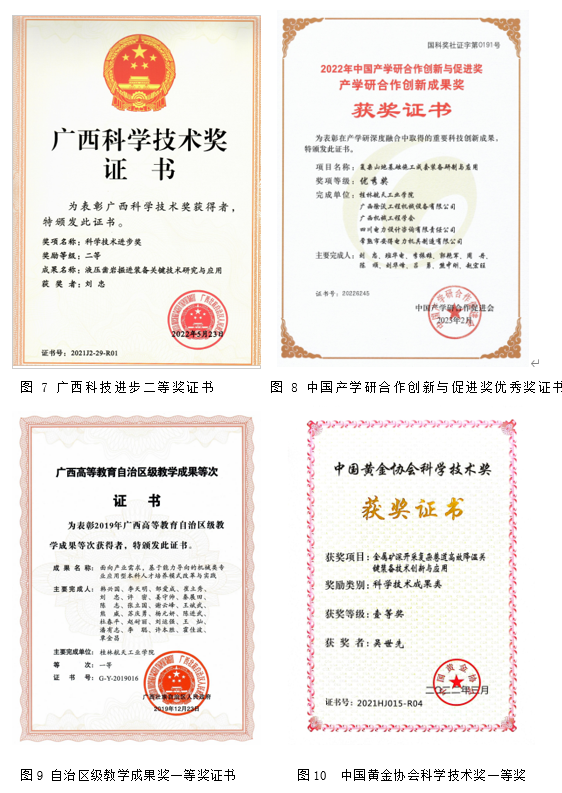 近年来,实验室在液压凿岩掘进装备、电力建设施工装备、航天功能材料制备、冶金矿山装备等理论与应用研究方面取得了一定的成绩,承担国家自然科学基金项目11项(含面上)、省部级科研项目16项,参加了国家相关部门科技攻关及校企合作项目40余项,获广西科技进步二等奖1项、广西教学成果一等奖1项、中国黄金协会科技进步一等奖1项、中国产学研创新成果奖(优秀)2项、中国安装协会科技进步三等奖1项、广西机械工程学会科技进步一等奖3项,积累了丰富的特种工程装备研究基础理论与技术应用经验。