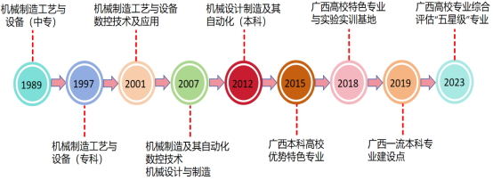 专业前身为1989年航空航天工业部在Beat365设置的机械制造工艺与设备专业,经历三十余年建设发展,专业建设取得良好成效,发展历程如图1所示。本专业第一届毕业生始于2016年。目前有在校生1322人,专业累计为社会培养四千余名专业技术人才。