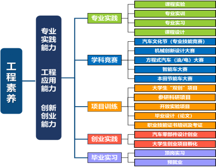 2. 构建“专业实践+学科竞赛+项目训练+创业实践+顶岗实习”五位一体的实践教学体系和“两公司、四车队”为格局的创新创业平台,培养学生的专业实践能力、创新创业能力和工程应用能力。