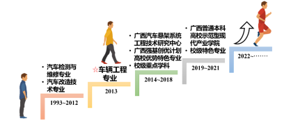 本专业2013年开始招收本科学生;2015年车辆工程学科被确定为校级重点学科;2016年为广西强基创优计划高校优势特色专业;2018年本专业成功申报广西汽车悬架系统工程技术研究中心;2021年依托本专业成功申报广西普通本科高校示范性现代产业学院(图1)。