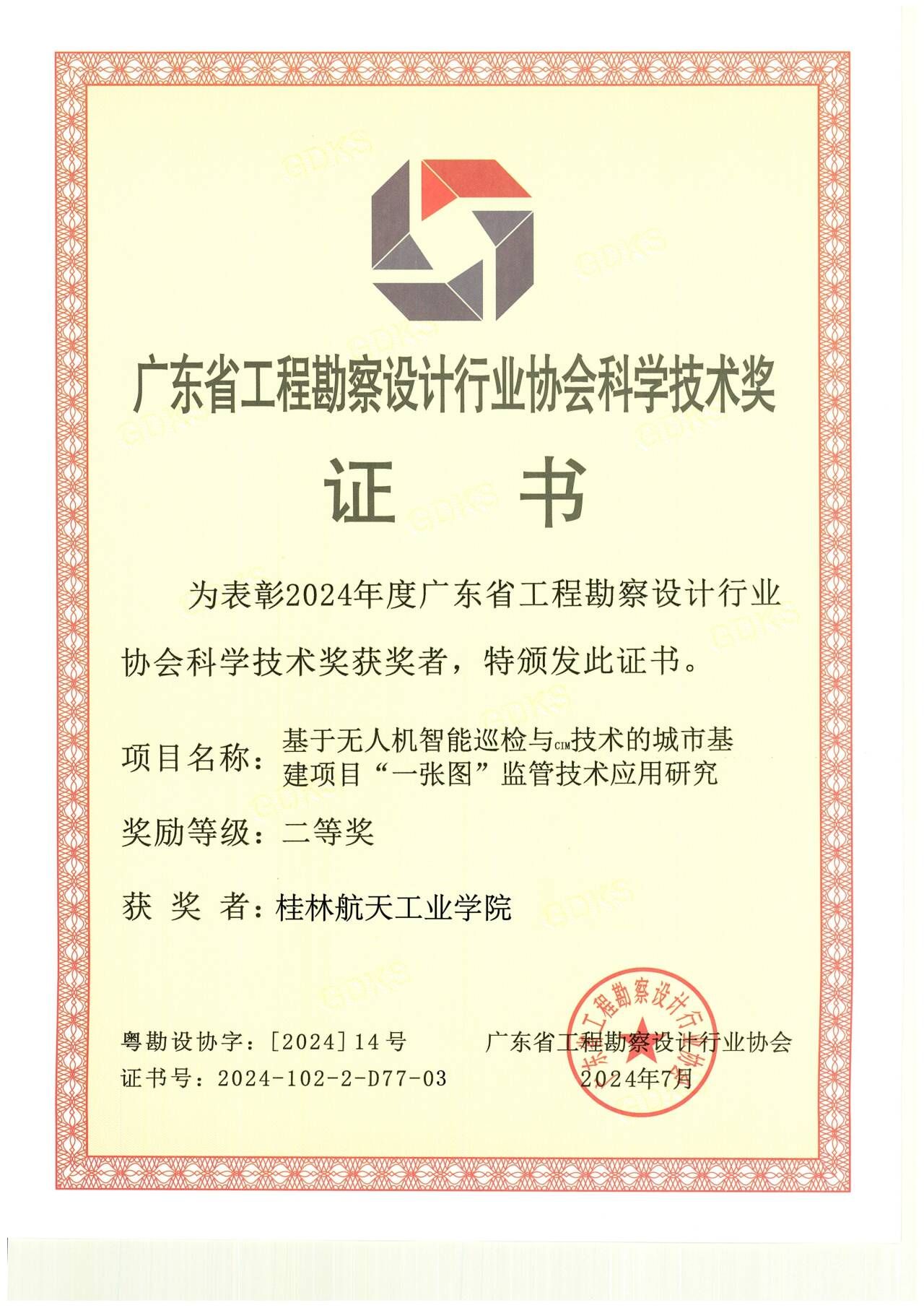 该科研团队与珠海市规划设计研究院等单位合作的项目《基于无人机智能巡检与CIM技术的城市基建项目‘一张图’监管技术应用研究》荣获广东省工程勘察设计行业协会科学技术奖二等奖。该项目成功地将无人机技术与城市基础设施管理相结合,可以提升城市基建项目的监管效率和质量。