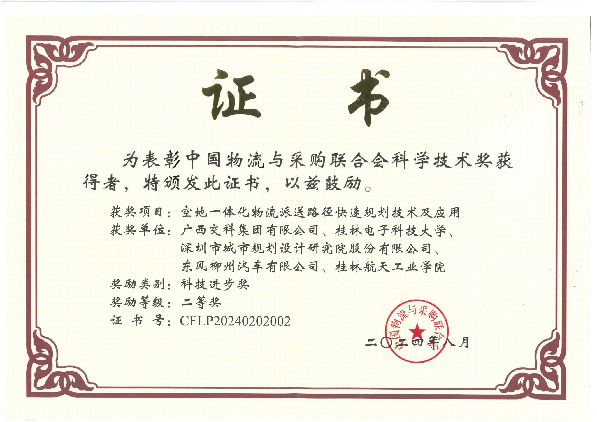 在物流派送路径规划技术方面,该团队与广西交科集团有限公司等单位申报的“空地一体化物流派送路径快速规划技术及应用”项目荣获2024年中国物流与采购联合会科技进步奖二等奖。该项目在物流派送路径规划上实现了快速和高效,对物流行业的发展具有积极的推动作用。