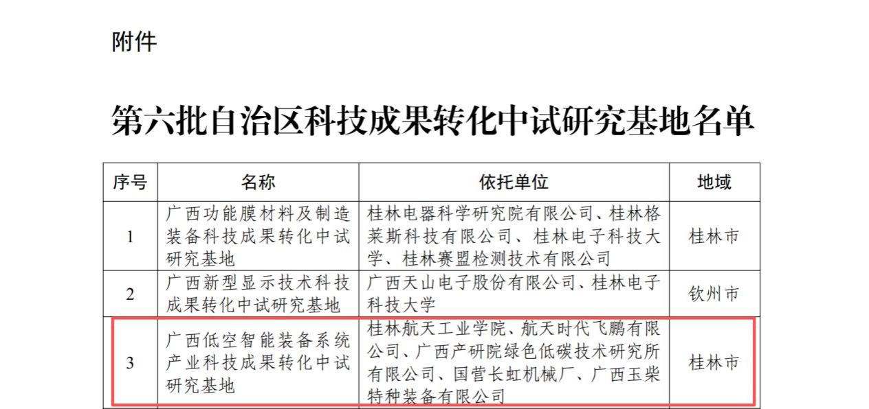 近日,广西壮族自治区科学技术厅正式公布了第六批自治区科技成果转化中试研究基地名单(桂科发〔2025〕413号)。由Beat365牵头,联合航天时代飞鹏有限公司、广西产研院绿色低碳技术研究所有限公司、国营长虹机械厂、广西玉柴特种装备有限公司共同申报的“广西低空智能装备系统产业科技成果转化中试研究基地”成功获批!这是Beat365获批的首个中试研究基地,也是广西第一个低空智能装备领域的自治区级中试研究基地,标志着Beat365在航空航天特色科研成果转化平台建设方面取得了新突破。