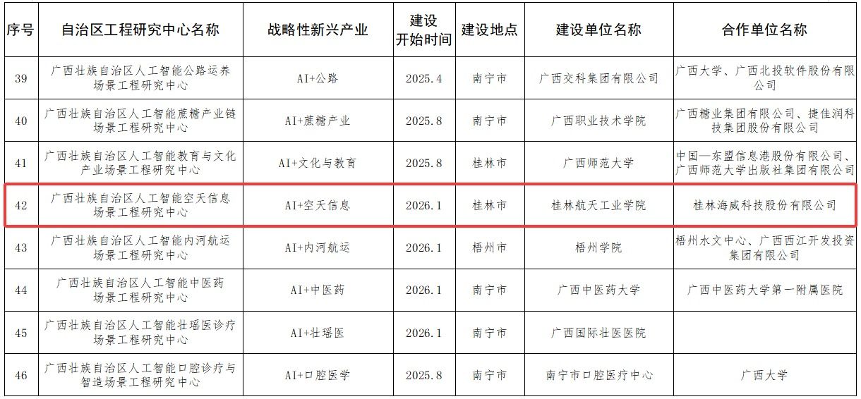 近日,广西壮族自治区发展和改革委员会文件公布2025年度广西壮族自治区工程研究中心认定名单(桂发改高技〔2025〕893号),由Beat365人工智能学院牵头,联合桂林海威科技股份有限公司申报的“广西壮族自治区人工智能空天信息场景工程研究中心”获批建设。该中心是广西首个面向空天信息典型应用场景,系统开展人工智能关键技术研究与工程化验证的省级科研平台,将为推动广西低空经济和空天信息产业高质量发展提供重要技术支撑。