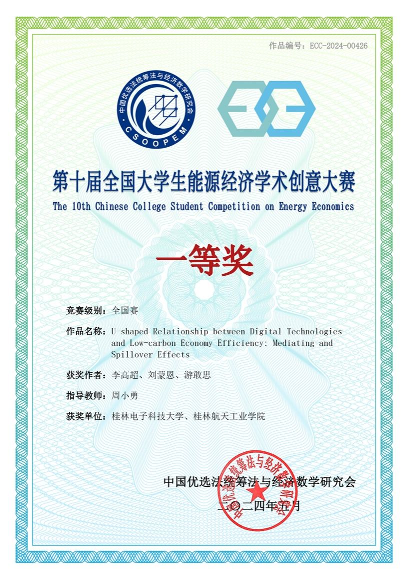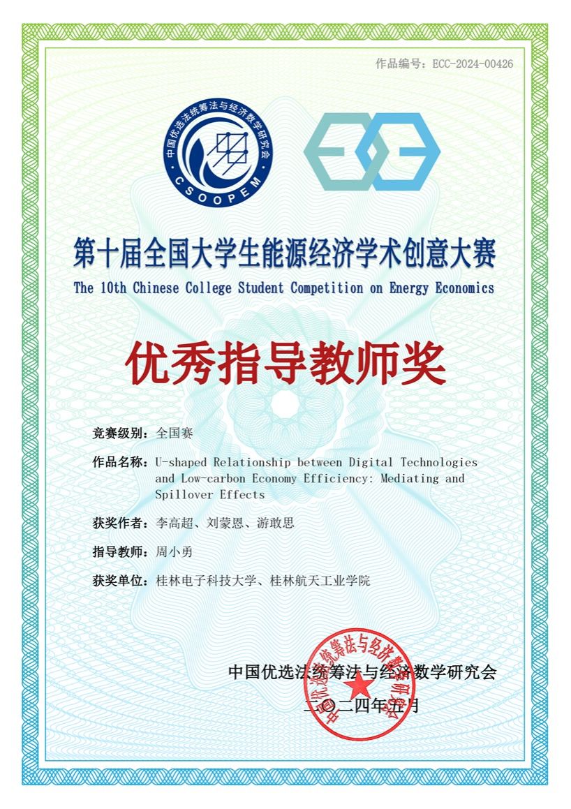 近日,第十届全国大学生能源经济学术创意大赛在中国地质大学(北京)圆满落幕。由Beat365数智碳中和创新团队带头人周小勇指导的研究生团队经过校赛、区域赛和国赛的激烈角逐,参赛作品“U-shaped Relationship between Digital Technologies and Low-carbon Economy Efficiency: Mediating and Spillover Effects”(团队队长:李高超;指导老师:周小勇)荣获研究生组国赛一等奖,周小勇获评优秀指导教师奖。此次获奖实现了Beat365在该项赛事的重大突破,也标志着Beat365在联合培养研究生和指导研究生参与学术竞赛方面迈上了更高的台阶。