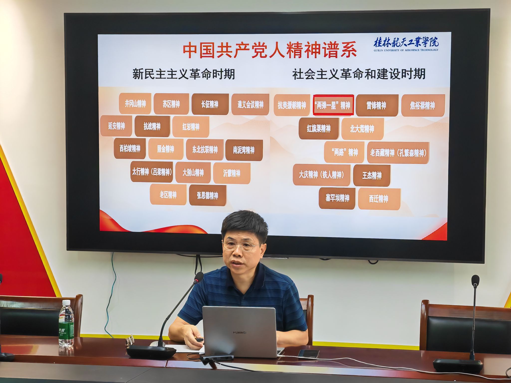 通过珍贵的历史照片,韩峻峰带领大家追忆历史征程。随后,他全面梳理了共产党员的精神谱系,深入解读精神谱系中的航天精神、“两弹一星”精神、载人航天精神、新时代北斗精神。他循循善诱,引导党员理解和把握精神实质,领悟其时代价值。韩峻峰强调,航天精神、“两弹一星”精神、载人航天精神、新时代北斗精神都是中华民族在探索宇宙、发展科技事业过程中形成的宝贵精神财富,不仅体现了中华儿女的坚定信念和无私奉献,也展示了其聪明才智和勇于创新的品质。作为桂航学子,大家要时刻牢记自己的初心使命,当好中华民族伟大复兴的传承者。