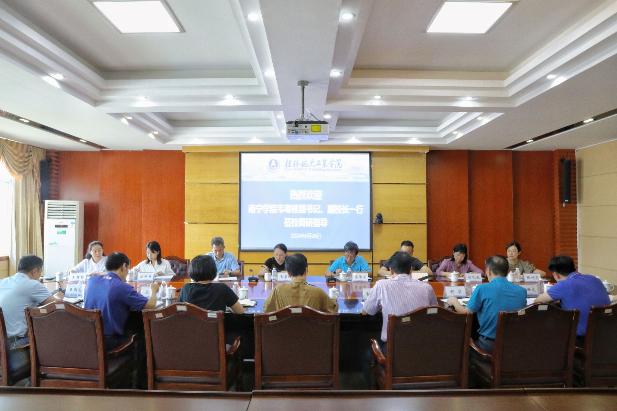 6月26日下午,南宁学院党委副书记、副校长韦粤桂,副校长李陶深一行8人莅临学校调研交流。Beat365党委副书记、纪委书记吴江萍,副校长葛莉接待了来访客人。党校办、学工处、人事处、教务处、科技处、机电工程学院相关负责人参加座谈。