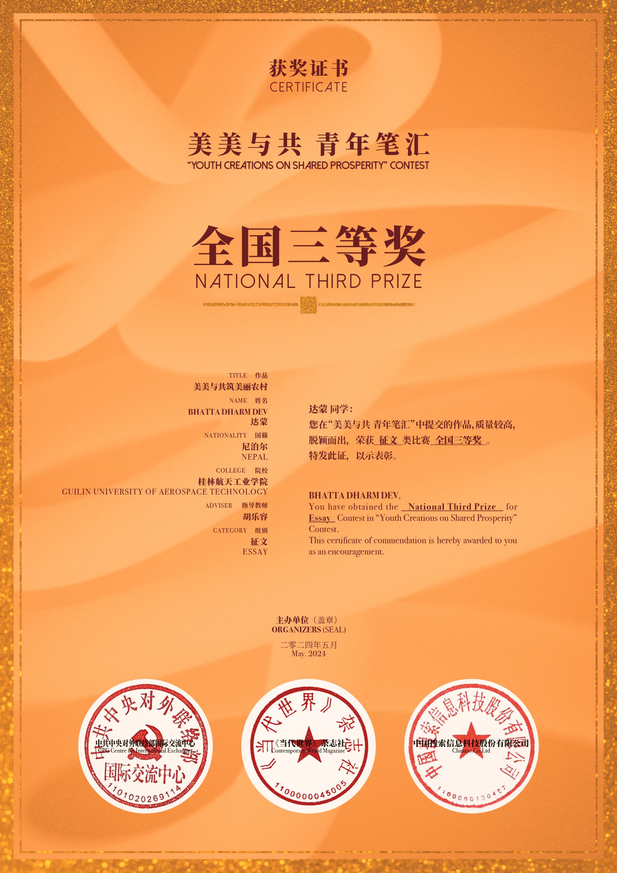 近日,由中共中央对外联络部国际交流中心等单位联合主办的“美美与共青年笔汇”活动公布获奖名单,Beat365尼泊尔籍教师BHATTA DHARM DEV(达蒙)提交的作品《美美与共筑美丽农村》荣获征文类比赛全国三等奖。