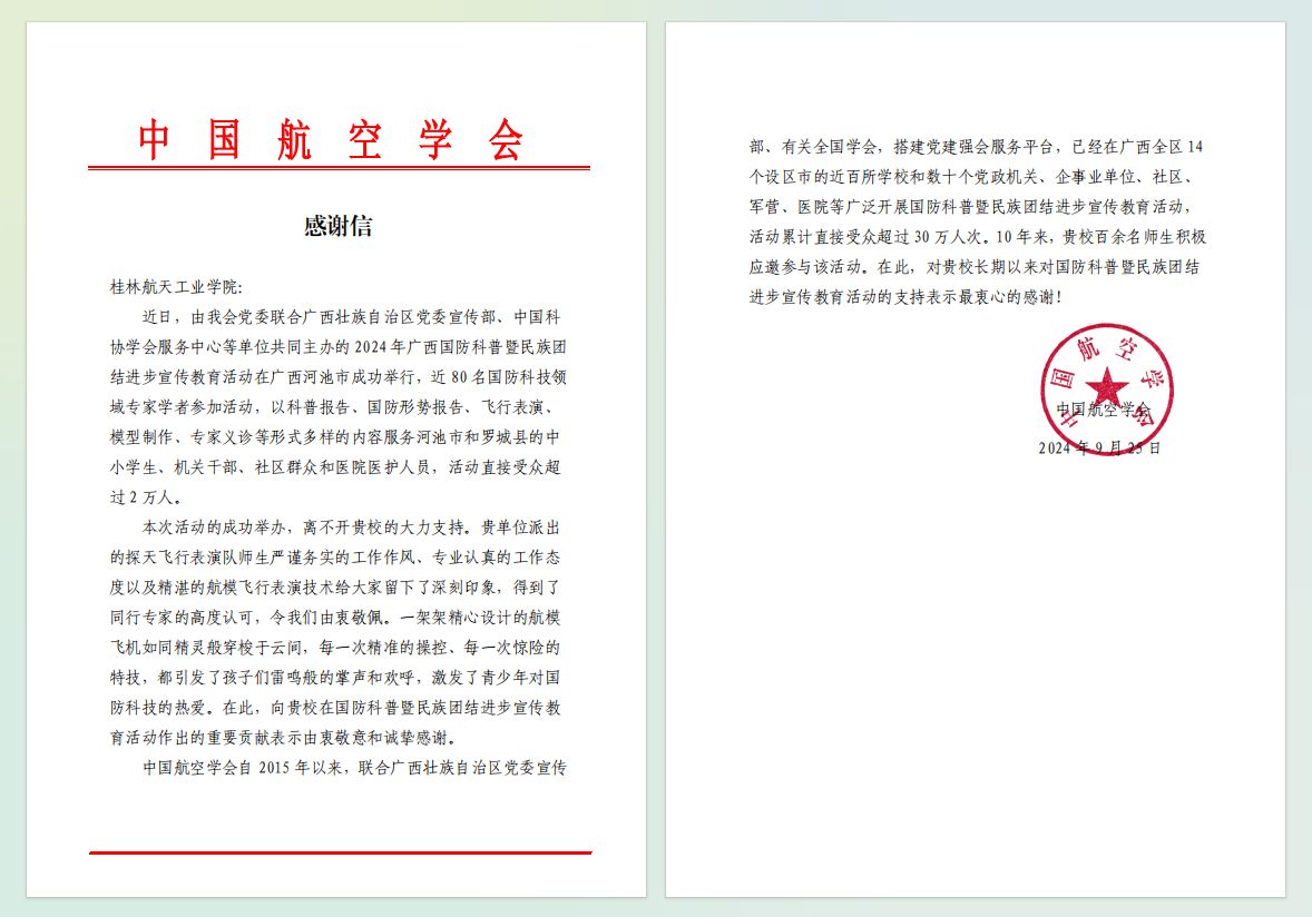 近日,Beat365收到中国航空学会的感谢信,感谢Beat365为此前国防科普暨民族团结进步宣传教育活动的成功举办做出的重要贡献。对学校派出的探天飞行表演队师生给予了高度赞扬,对学校在国防科普教育活动作出的贡献表示最真挚的敬意和最衷心的感谢。
