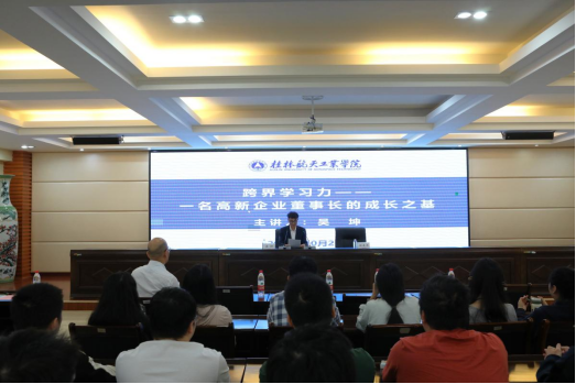 随后,吴坤进行了“跨界学习力——一名高新企业董事长成长之基”的经验分享。这些经验不仅能够启发学生们的创业思维和职业规划,激励有志于自主创业的年轻人找到自己的成长之路,还能够提供实用的职业发展建议和成功经验,同时加强校友与母校之间的情感联系,增强学生们对母校的认同感和归属感,从而提升学生的综合能力和未来的就业竞争力。
