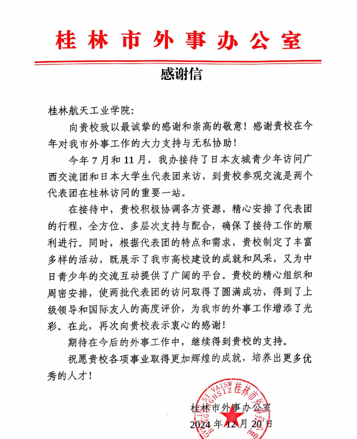 信中写道:“贵校积极协调各方资源,精心安排了代表团的行程,全方位、多层次支持与配合,确保了接待工作的顺利进行。同时,根据代表团的特点和需求,贵校制定了丰富多样的活动,既展示了我市高校建设的成就和风采,又为中日青少年的交流互动提供了广阔的平台。贵校的精心组织和周密安排,使两批代表团的访问取得了圆满成功,得到了上级领导和国际友人的高度评价,为我市的外事工作增添了光彩。”