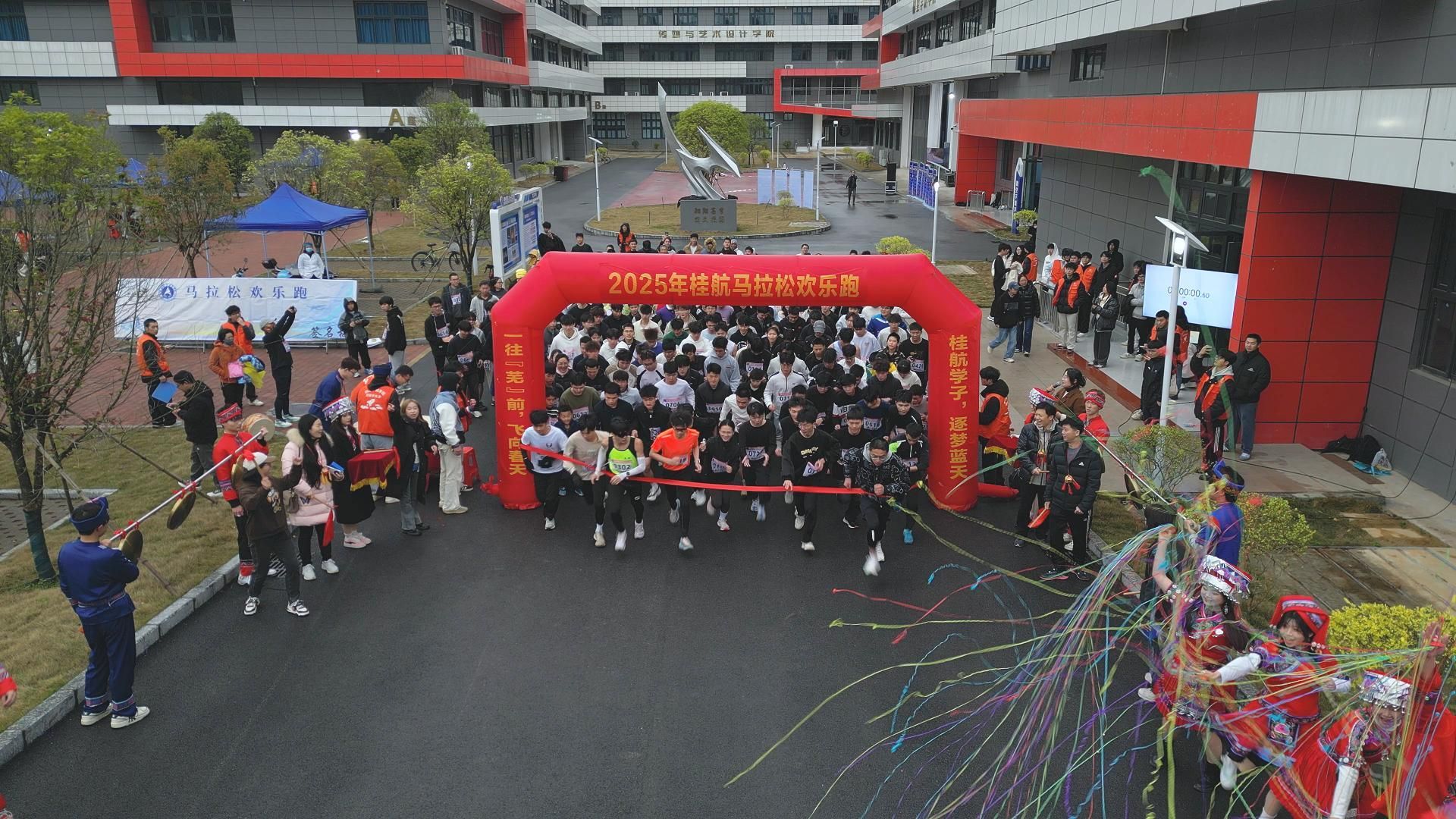 三月三中春潮涌动,航天路畔歌圩飞扬。3月30日早上7:30分,身着少数民族服饰的同学与选手们汇聚南校区擎天楼下,以山歌开场热力拉开了2025年桂航马拉松欢乐跑的序幕。
