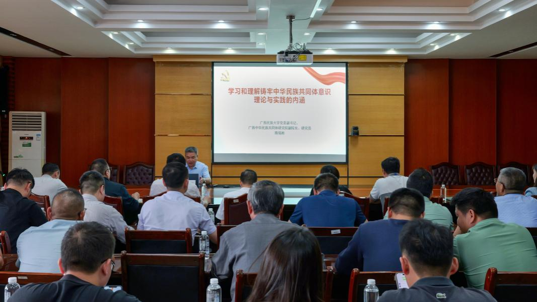 陈铭彬以“学习和理解铸牢中华民族共同体意识理论与实践的内涵”为题,从铸牢中华民族共同体意识的深刻内涵、面临的国际国内形势和挑战、理论精神实质、核心要义以及新部署、新要求和实践路径等四个方面,系统阐释了这一重大战略思想的时代价值和实践要求。为高校准确把握新时代民族工作主线、深化民族团结进步事业提供了思想指引和行动指南。