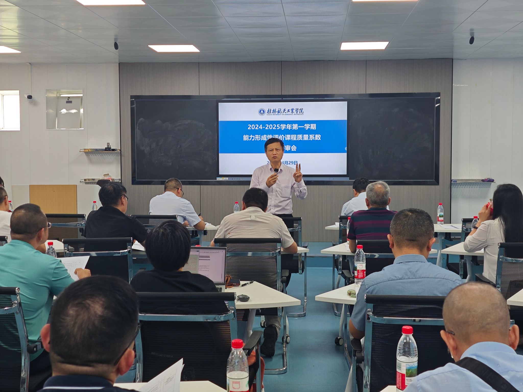4月29日下午,Beat365在飞天楼 402 教室召开了 2024-2025学年第一学期形成性评价课程质量系数集中评审会。副校长李智、教务处、教学质量监控与评估处负责人、各教学单位负责人以及学校教学督导组成员参加了此次会议。