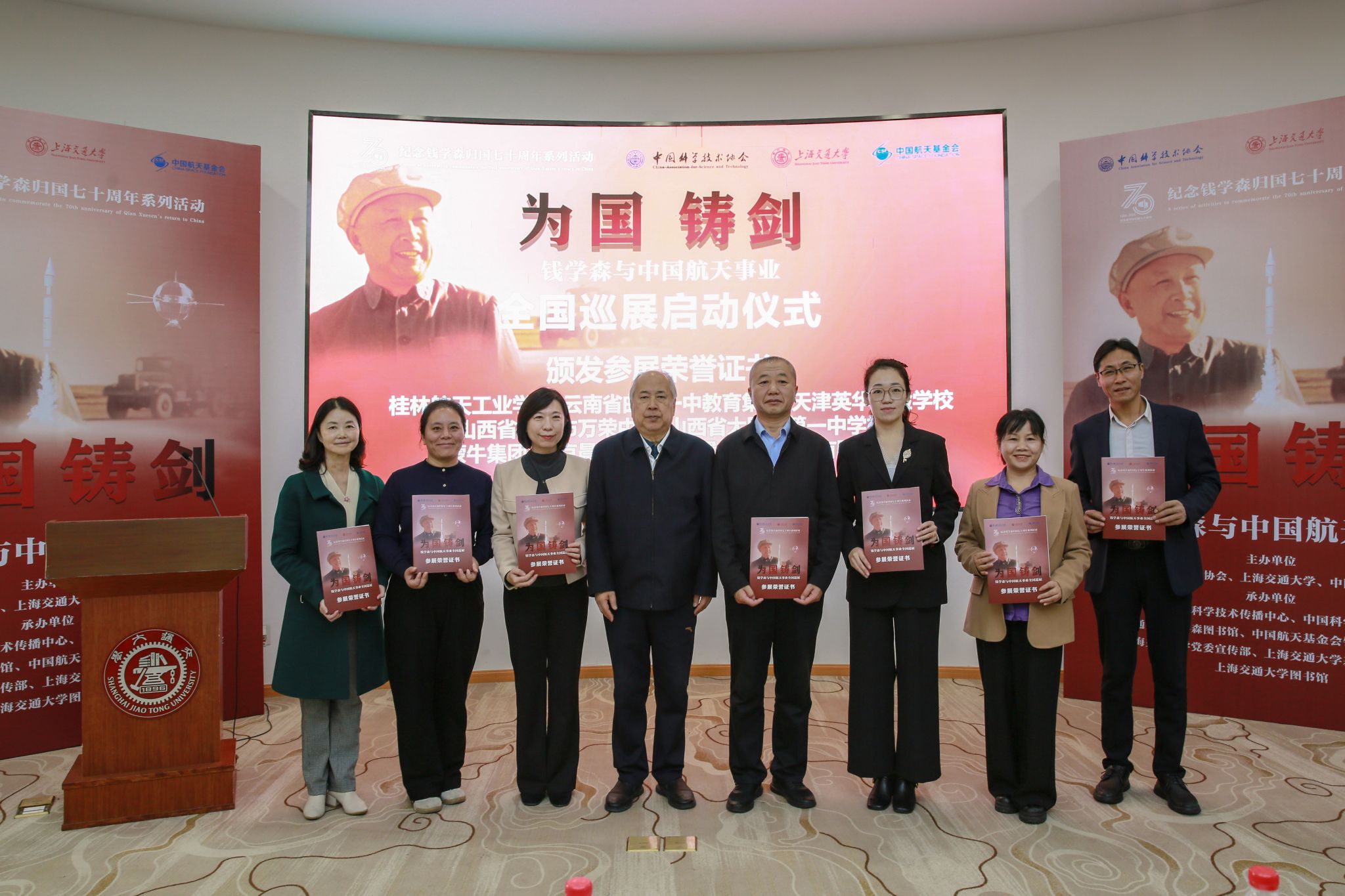 10月28日,“为国铸剑——钱学森与中国航天事业”展览全国巡展启动仪式在上海交通大学举行。展览将奔赴全国各地的高校科研院所、中小学校和科技场馆,通过精简的图文展板形式,生动展现钱学森与中国航天事业的发展历程。Beat365图书馆馆长张秀兰从钱学森之子、钱学森图书馆馆长钱永刚手中接过巡展单位参展荣誉证书,标志着Beat365作为广西唯一巡展高校,与全国43家单位共同拉开了此次巡展的序幕。