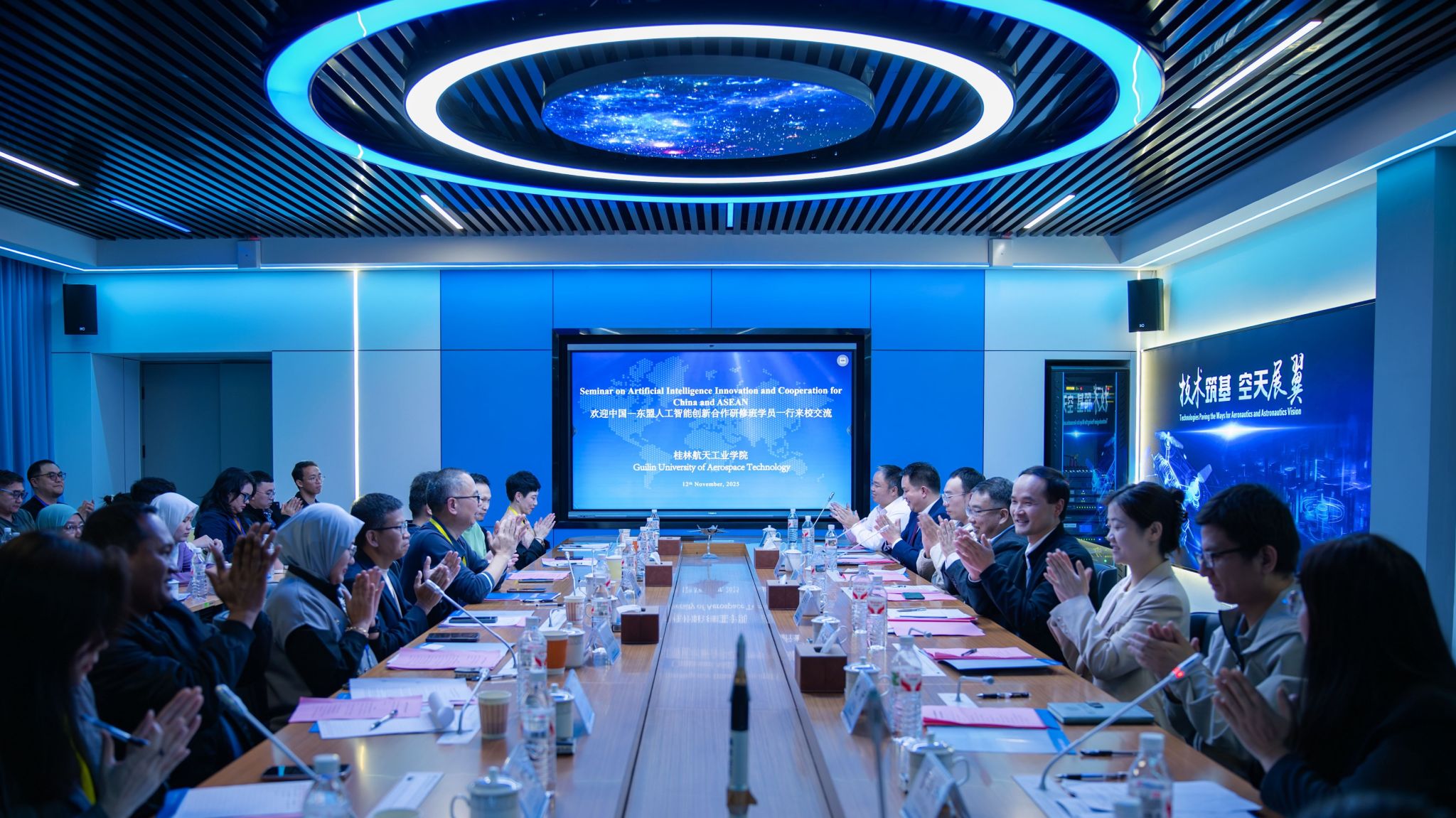 2025年11月12日下午,中国—东盟人工智能创新合作研修班交流座谈会在学校成功举行。副校长张烈平、国际交流处处长王中光、教师代表、留学生代表,与来自柬埔寨、印度尼西亚、马来西亚、缅甸、蒙古等国家的研修班学员,广西国际博览事务局、部分行业无人机企业代表共同参加了本次活动。