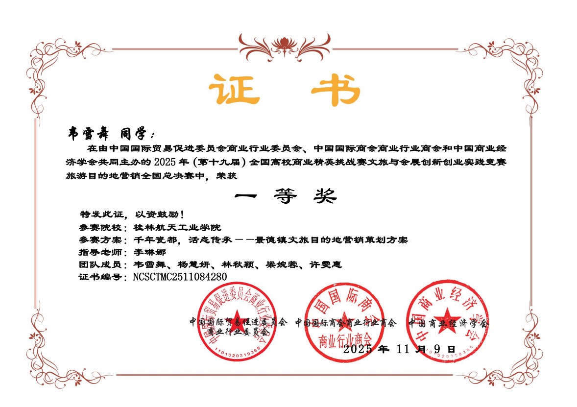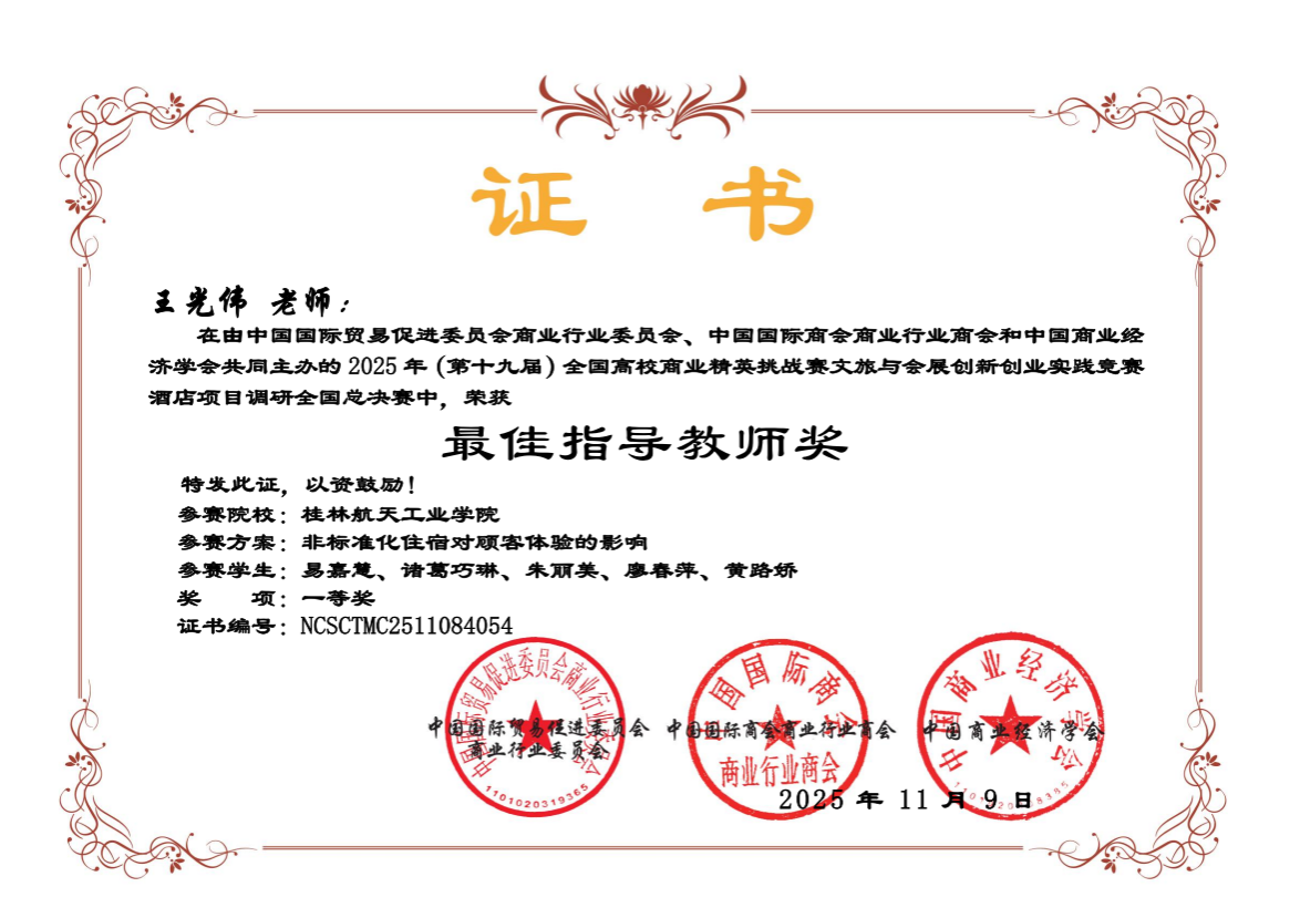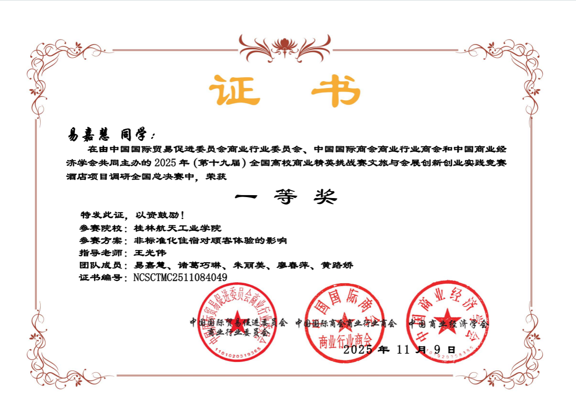 本次比赛由中国国际贸易促进委员会商业行业委员会、中国国际商会商业行业商会和中国商业经济学会联合主办,涵盖文化旅游竞赛、会展竞赛、酒店专业竞赛、文创产品设计等多个赛项。Beat365参赛学生凭借扎实的专业基础知识、卓越的团队协作能力,在指导老师的悉心指导下,经过“知识赛-广西区赛-全国总决赛”的层层选拔与角逐,与众多高校参赛队伍同台竞技,最终取得学校参赛以来最好的成绩。其中,一等奖作品《非标准化住宿对顾客体验的影响》《千年瓷都,活态传承——景德镇文旅目的地营销策划方案》经过一年多的打磨,深入实践调研,将专业理论与创意方案紧密结合,不负众望获得佳绩。